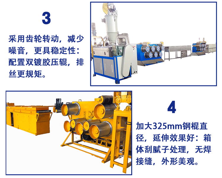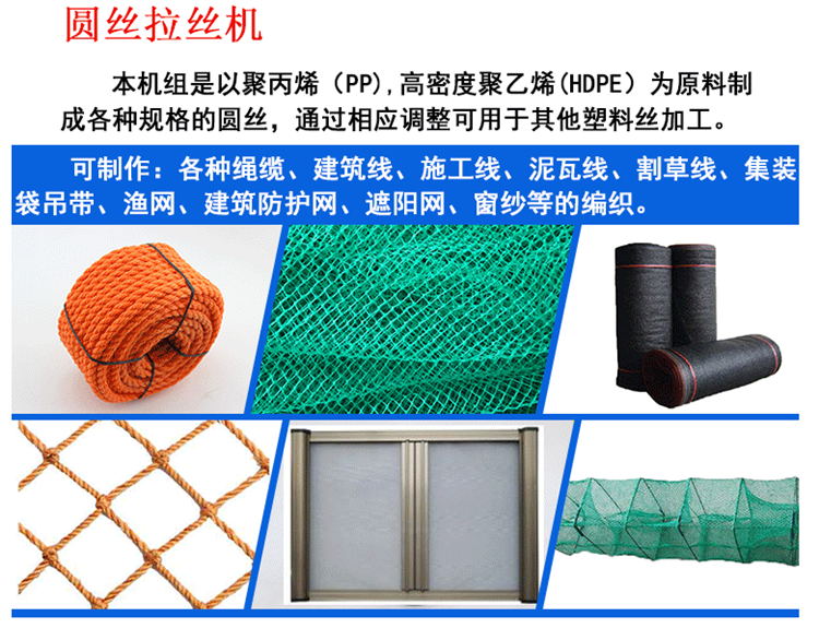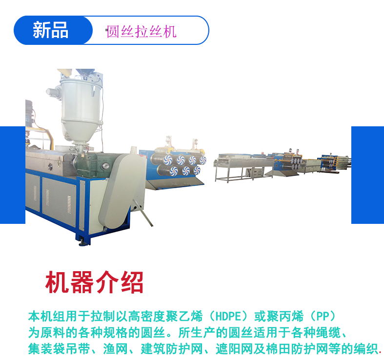 本機組是以聚丙烯(PP),高密度聚乙烯(HDPE)為原料制成各種規(guī)格 的圓絲,通過相應調整可用于其他塑料絲加工。